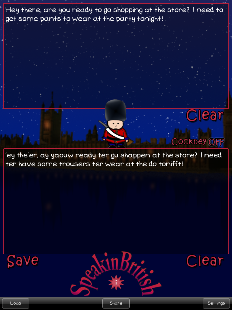 'Ello chaps! Speakin British is a smashing app that adds a British accent and/or a little cockney slang to your messages. Indeed, it is easy to use, just type a message and translate it in the tap of a button. Your translations can then be shared in a moment's notice to all your friends! Chin wag with your blokes and send them cockney messages that are full of gobbledygook or impress your bird with a sexy, distinguished accent like James Bond ! So, the Best of British to you, Cheerio!
