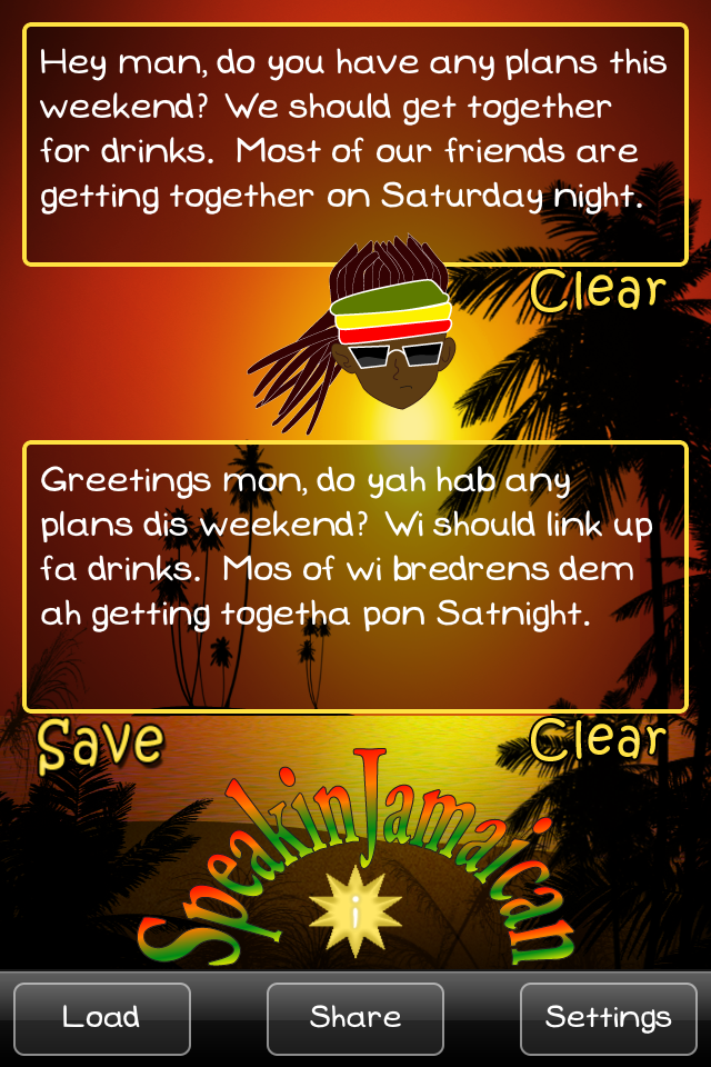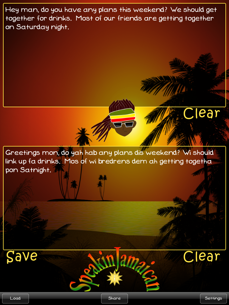 Wa'ppun? Welcome ta Speakin Jamaican! Dis app be cris & easy to use mon, type a message and translate it in the tap of a button then send it ta all your bredren. Truss mi, dis app will leave you feelin so upful, use it to channel your inner Rastafarian, humor your breddas, or satisfy your curiosity about the Jamaican language!