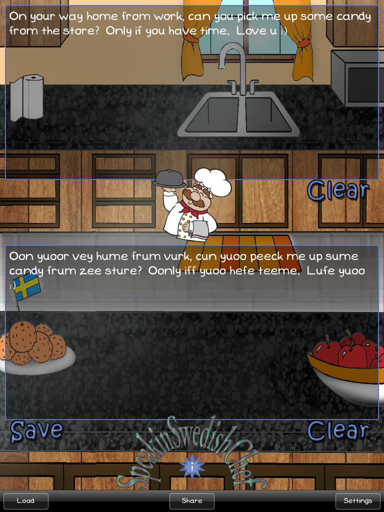 Hej! Velcume to Speakin Swedish Chef. Put a funny new twist on your conversations by translating all your messages to sound as if you have the chef's swedish accent. With this easy to use application you can type a message and translate it in the tap of a button, then message it to your friends.